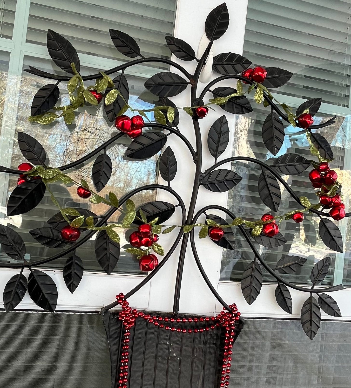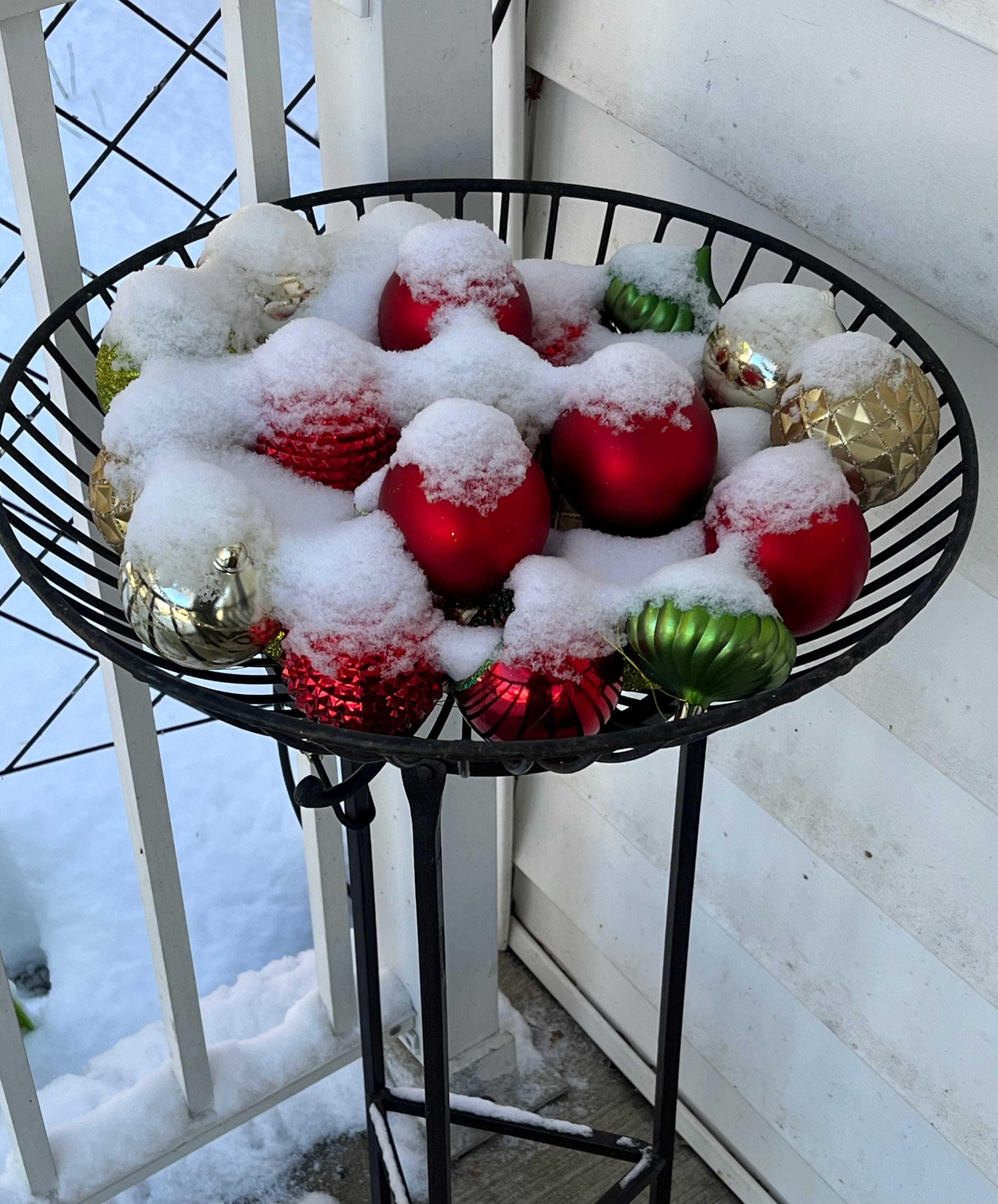 You’ve seen a photo of my wonky little tree with just a star and electric candles. My days of hanging baubles are over. However, on the porch I always have a collection of shiny ornaments in a wrought iron bowl. Sometimes a squirrel will carry one away but for the most part, they sit undisturbed until after the New Year.