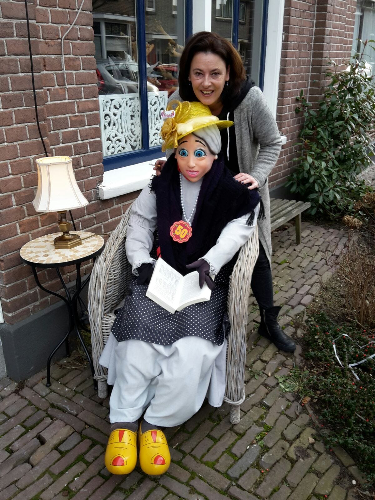 Instead of cake, expect Vlaai to be served. . Vlaai could best be described as a tart which has a leaved yeast bottom formed as the container for cherries and cream, sometimes apricots and rice pudding. You get the idea. It’s delicious. And comes from the Vlaai bakkerij. The whole business is an expensive proposition. Small gifts are received and opened in front of the group who passes them around the circle. And when you turn 50, you become a Sarah or Abraham (wise, at last)…friends and family put a large figure outside your house as below (one of the daughters of my friend 10 years ago).